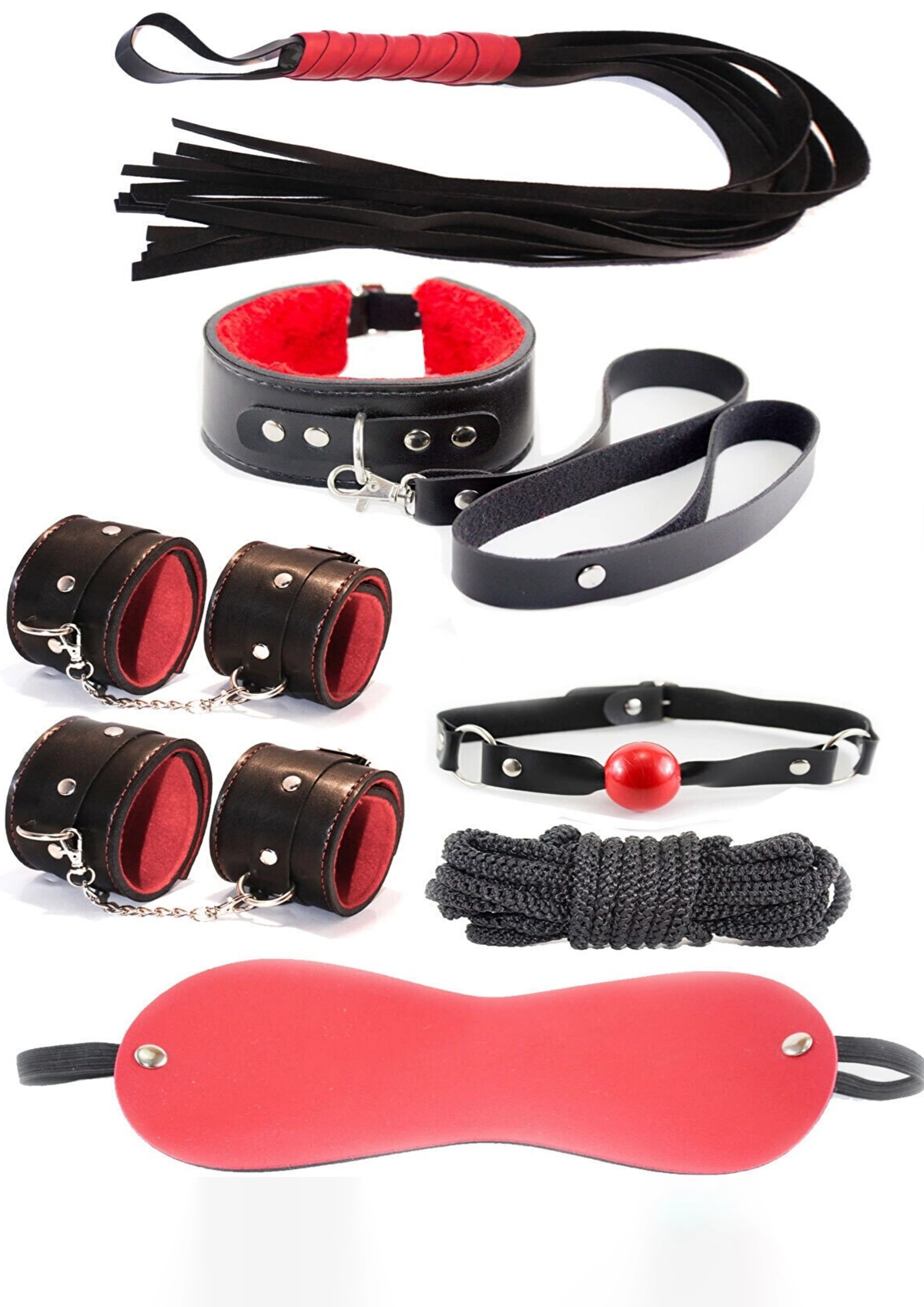 Deluxe BDSM Fantezi Seti – Maske, Ağız Topu, Tasma, Kelepçe, Kamçı, Halat ve Bağlama Aksesuarları