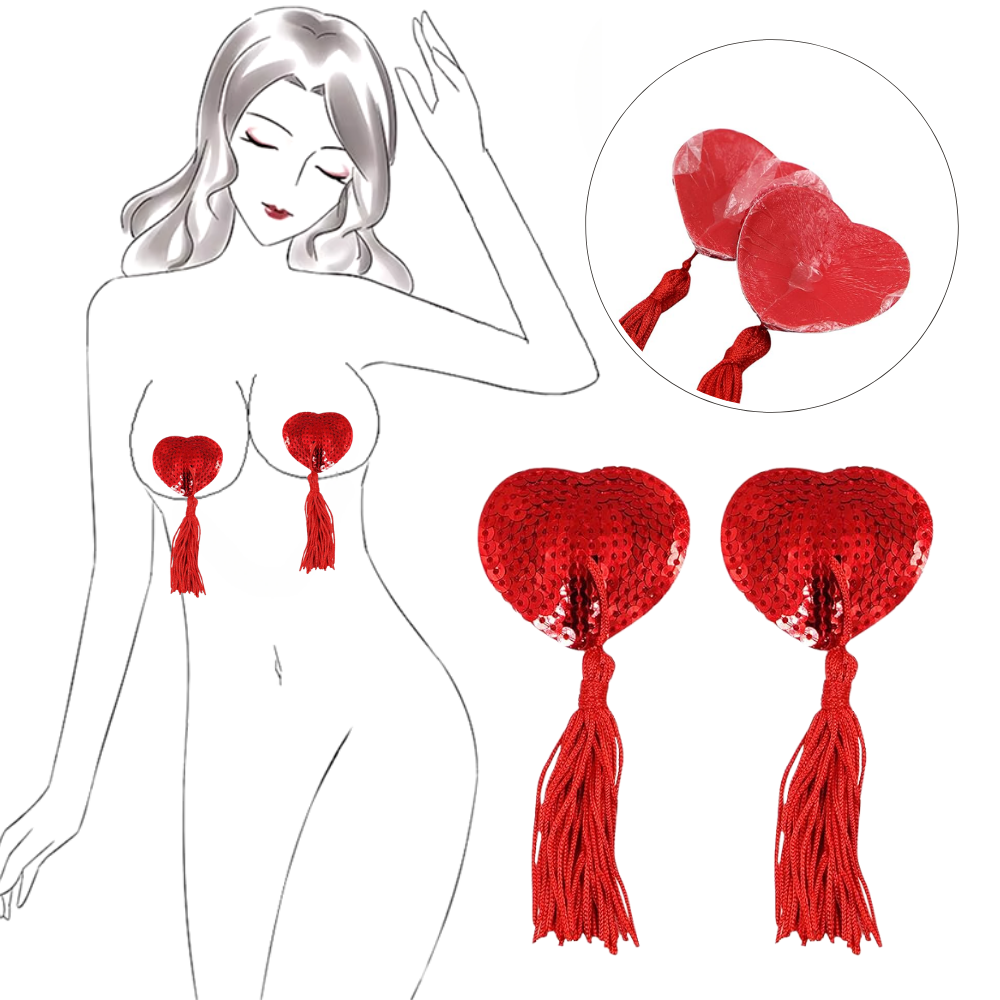 Cesur, zarif ve eğlenceli… Kırmızı kalp şeklindeki yapışkanlı meme ucu gizleyici, özgüveninizi ortaya koyarken, geceye şıklık ve tutku katar. Parıltılı dokusu ve sallanan püskülleriyle dikkat çeken bu aksesuar, hem gece kıyafetleriyle hem de özel kombinlerle mükemmel uyum sağlar.